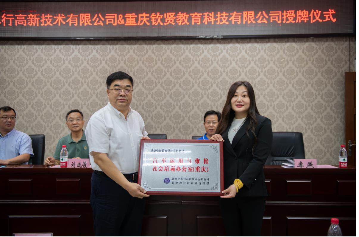 会上,北京中车行高新技术有限公司相关领导对15名1+X证书制度汽车领域重庆市专家颁发汽车运用与维修(含智能新能源汽车)专家证书。还举行了社会培训管理办公室授牌仪式,由北京中车行高新技术有限公司董事长曹之明向重庆钦贤教育科技有限公司董事长李燕授牌,社会培训管理办公室主要负责汽车行业、企业开展1+X汽车运用与维修(含智能新能源汽车)职业技能等级证书的培训和考评管理,管理已遴选的社会培训机构,有助于职业技能等级证书更好地在企业、行业推广。