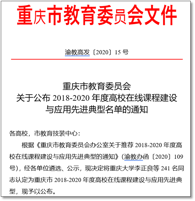 为总结高校在线课程建设与应用工作成效,树立课程建设与应用先进典型,努力提升“一流课程”建设水平,助力“双一流”和“双高”建设,近日,重庆市教育委员会公布了2018-2020年度高校在线课程建设与应用先进典型名单(渝教高发〔2020〕15号),我校代才莉等5位教师获得该项荣誉。