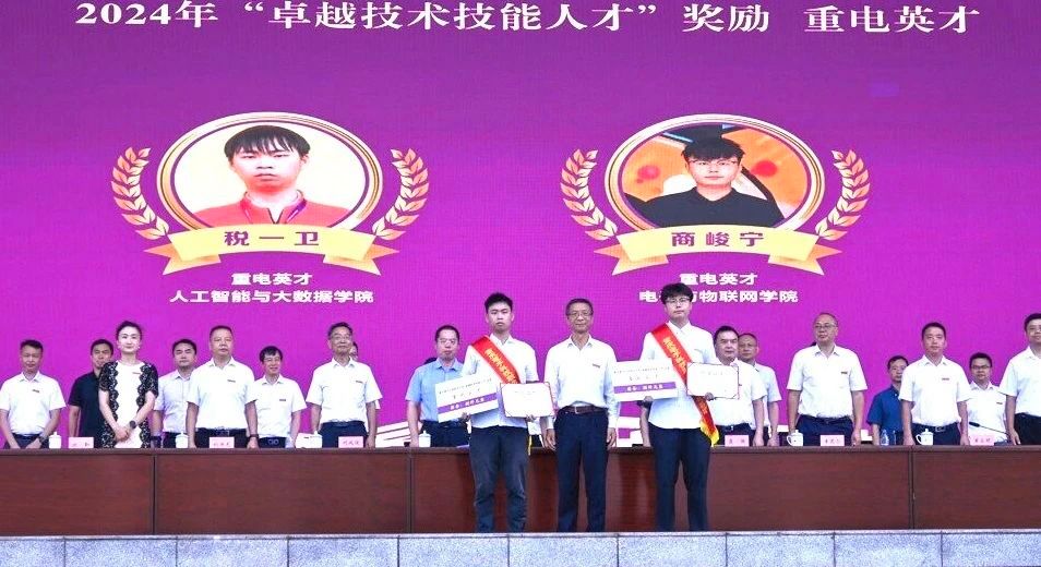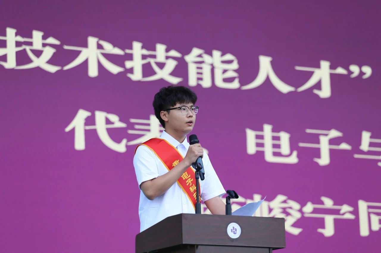 “重电英才”,电子与物联网学院商峻宁同学在发言中分享了他的技能成才之路,并表示,在重电的三年时光,是他人生中最美好的记忆之一。这段旅程中,他不仅系统地掌握了扎实的专业知识和技能,更在无数次挑战与磨砺中,实现了从青涩到成熟的蜕变,收获了宝贵的成长与坚不可摧的自信。