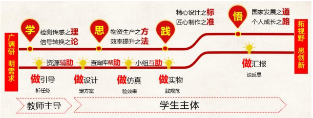 比赛课程属于传感器应用开发模块,该模块是我校双高专业物联网应用技术专业群的专业模块。课程教学策略践行最新政策要求:根据工学一体,行动导向的教学理念,采用“五做三助,学思践悟”的总教学策略,以学生为主体,教师为主导开展教学活动。课前“广调研,明需求”,课中五做,即“做引导,析任务;做设计,定方案;做仿真,验效果;做实物,践规范;做汇报,谈反思”,课后“拓视野,思创新”。“三助”即“在线资源辅助”预习,“传感器查询库帮助”设计,“小组互助”解决问题。任务驱动+德育推动,双线并举,育人于潜移默化之中。学生在任务实施的过程中,学会检测传感与信号转换的理论;思考物资生产与效率提升的方法;践行精心设计与匠心制作的标准;领悟国家发展与个人成长的道路。