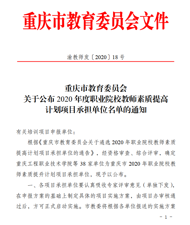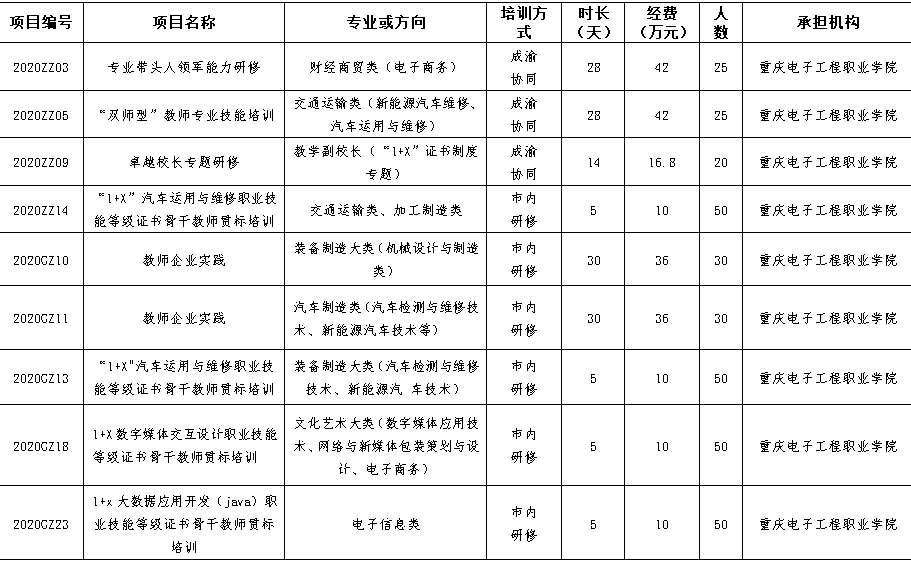 9月17日,重庆市教育委员会关于公布2020年度职业院校教师素质提高计划项目承担单位名单的通知,我校国培基地申报的《“双师型”教师专业技能培训交通运输类(新能源汽车维修、汽车运用与维修)》、《1+x大数据应用开发(java)职业技能等级证书骨干教师贯标培训电子信息类》和《教师企业实践装备制造大类(机械设计与制造类)》等9个项目成功中标,项目总经费212.8万元,全额由市财政提供。
