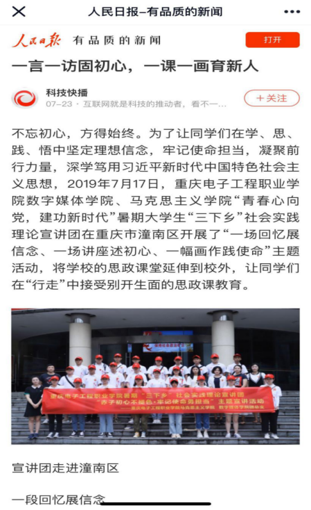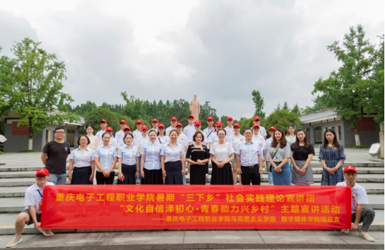 数字媒体学院2019年暑期“三下乡”社会实践理论普及宣讲团由数字媒体学院团总支书记吴艾佳、专业教师陈小欣、思想政治辅导员杜鹤淦、马克思主义学院思政课教师周叶露、姜春英、孙美玲及25名学生志愿者组成。实践团队于今年7月在潼南区以集中宣讲、分散宣讲、自主学习的方式相继开展《赤子初心不褪色,牢记使命勇担当》《青春建功新时代,振兴美丽新乡村》《文化自信泽初心,青春助力兴乡村》主题宣讲3场,在杨闇公烈士陵园、杨尚昆故里、杨尚昆故居管理处、东风社区服务中心、双江古镇等地组织开展新思想宣讲、文化自信主题作品展、“建功新时代”摄影作品展、垃圾分类宣讲、乡村振兴调研等活动10场;入户走访50余户,随机走访180余人次,播放乡村振兴电影3场,发放问卷调查300份。