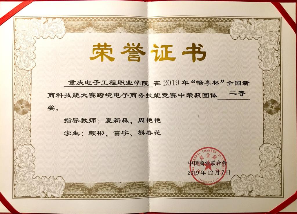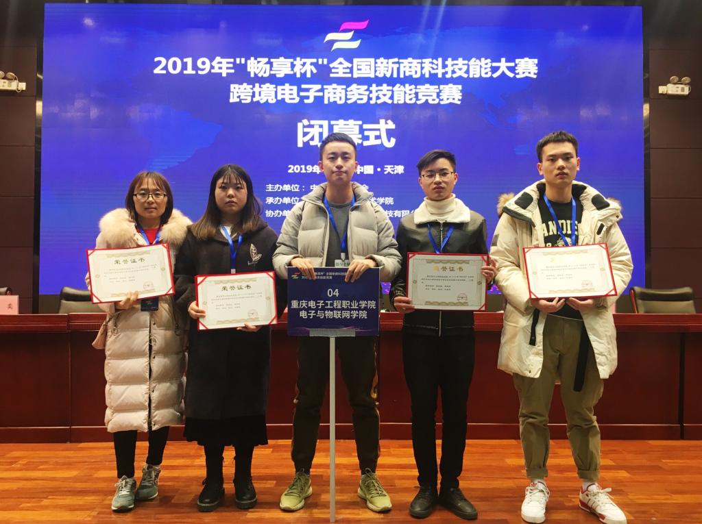 12月7日,2019年“畅享杯”全国新商科技能大赛跨境电子商务技能竞赛全国总决赛在天津落下帷幕。大赛由中国商业联合会主办,天津轻工职业技术学院和中教畅享(北京)科技有限公司联合承办,来自全国各地的41所院校参赛队经过4个小时的激烈比拼,最终,在夏新森、周艳艳两位老师的指导下,我校电子与物联网学院电子产品营销与服务专业的颜彬、雷宇、熊春花三位同学荣获团体二等奖。
