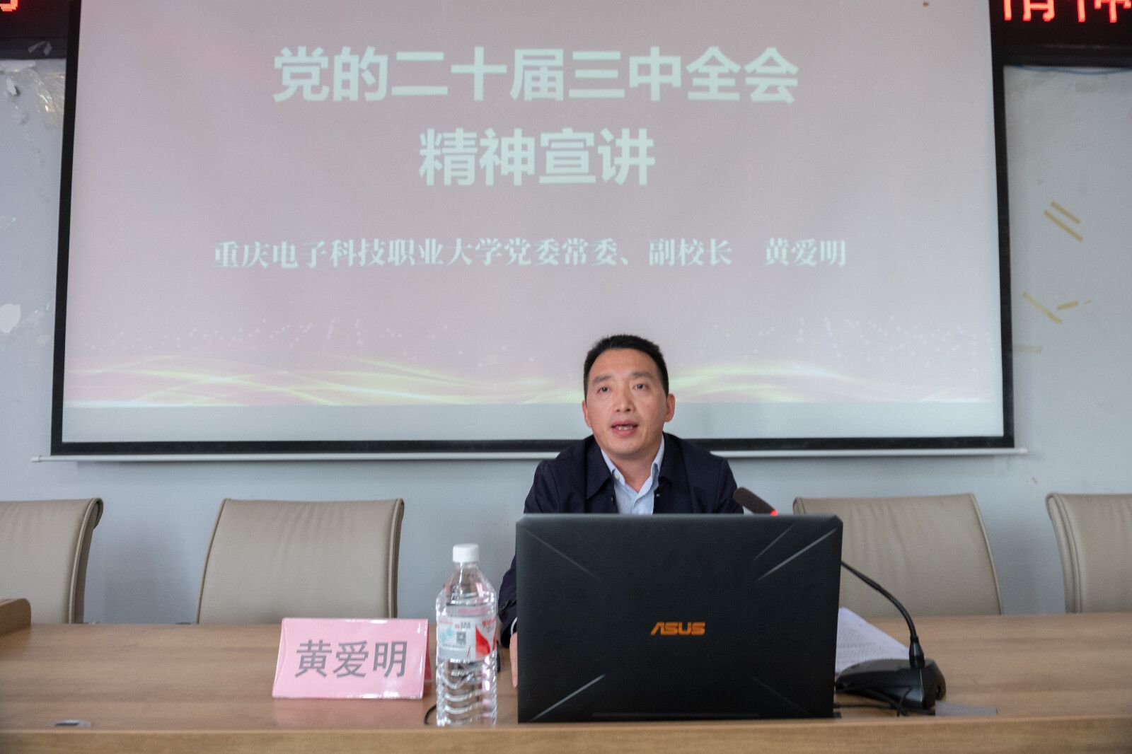 10月24日下午,校党委常委、副校长黄爱明在知行楼A518会议室,向工会、资产处、团委、图文信息中心、数字媒体学院等五个部门的全体党员和师生代表宣讲党的二十届三中全会精神。