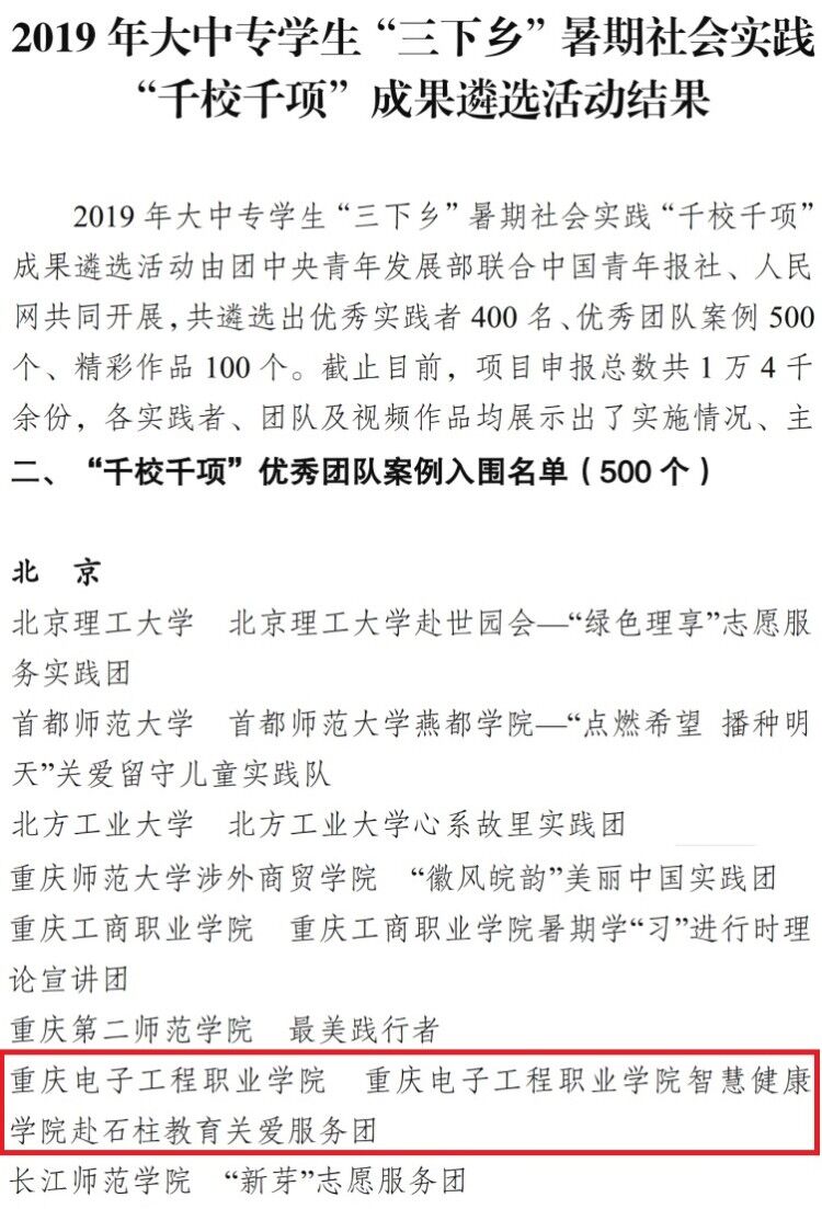 近日,由团中央青年发展部联合中国青年报社、人民网共同开展的2019年大中专学生“三下乡”暑期社会实践“千校千项”成果遴选活动结果揭晓。经过作品申报、资格筛选、网络投票、专家评审等多重环节,重庆电子工程职业学院智慧健康学院赴石柱教育关爱服务团荣获优秀团队案例。