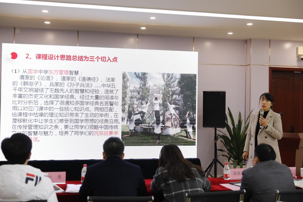 会上,我院校级培育的课程思政项目负责人罗炜、张敏、管亚风、刘盈含四位教师分别就校级培育和立项的专业及课程作汇报,包括市场营销专业和《通用管理》、《智能仓储与配送》及《跨境电子商务运营》三门课程,针对在教学实践中如何挖掘、提炼和呈现思政元素作了凝练汇报。