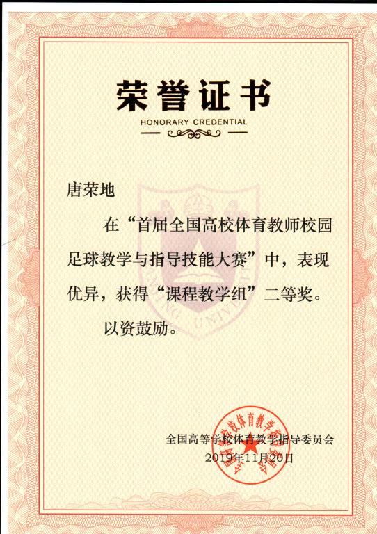 我校体育与国防教学部教师唐荣地做为重庆市教委推荐的高职组唯一代表,最终凭借精心的教学设计、扎实的专项技能和充沛的体能,从近两百名参赛足球教师中脱颖而出荣获课程教学组二等奖。
