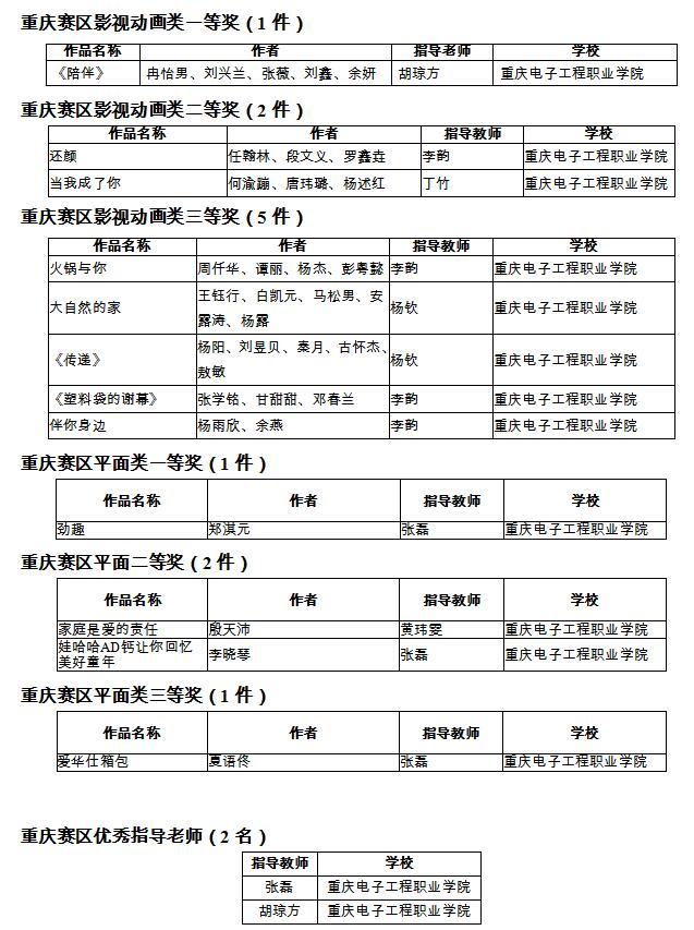 近日,重庆市教育委员会发布了《关于第十一届全国大学生广告艺术大赛(重庆赛区)获奖情况的通报》,全市有42所学校的21558件作品参加了本届竞赛。我校获得重庆赛区影视动画类一等奖(1件),重庆赛区影视动画类二等奖(2件),重庆赛区影视动画类三等奖(5件),重庆赛区平面类一等奖(1件),重庆赛区平面二等奖(2件),重庆赛区平面类三等奖(1件),重庆赛区优秀指导老师(2名)。