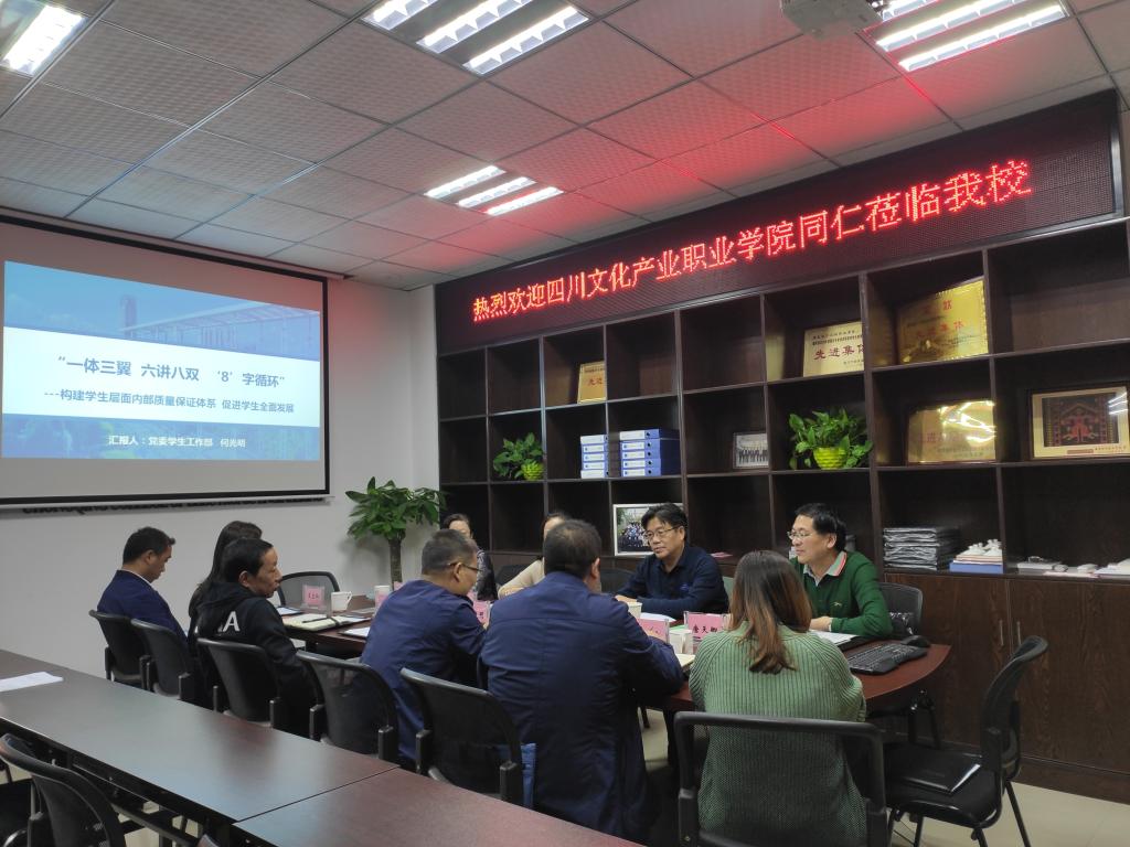 冉学农对四川文化产业职业学院同仁们的到来表示热烈欢迎,并就我校的校情、校史、师资队伍建设、开云电子平台_开云(中国)模式、历年办学成果等方面作了详细介绍。党委学工部部长何光明作了题为《“一体三翼六讲八双‘8’字循环”——构建学生层面内部质量保证体系 促进学生全面发展》的交流报告。双方就学校学生素质教育管理情况、辅导员队伍建设等方面进行了深入探讨。