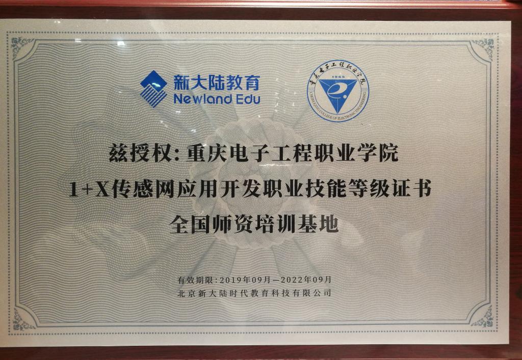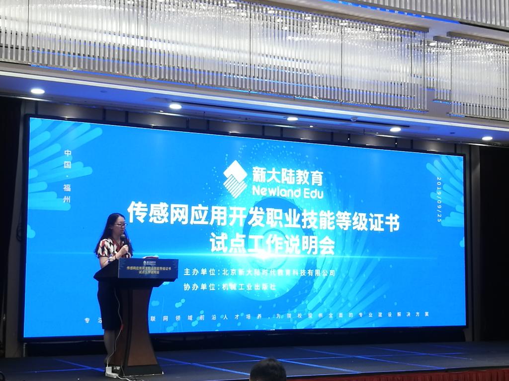 2019年9月25日,传感网应用开发职业技能等级证书试点工作说明会在福州召开,此次说明会由北京新大陆时代教育科技有限公司主办。教育部行政部门相关领导、行业企业及院校相关专家、拟申报传感网应用开发职业技能等级证书试点工作的院校负责人和学科带头人等300余人参加本次大会。会议现场揭晓了2019年“1+X传感网应用开发职业技能等级证书首批全国师资培训基地”并进行了授牌仪式,我校电子与物联网学院院长陈良作为学校代表上台接牌。