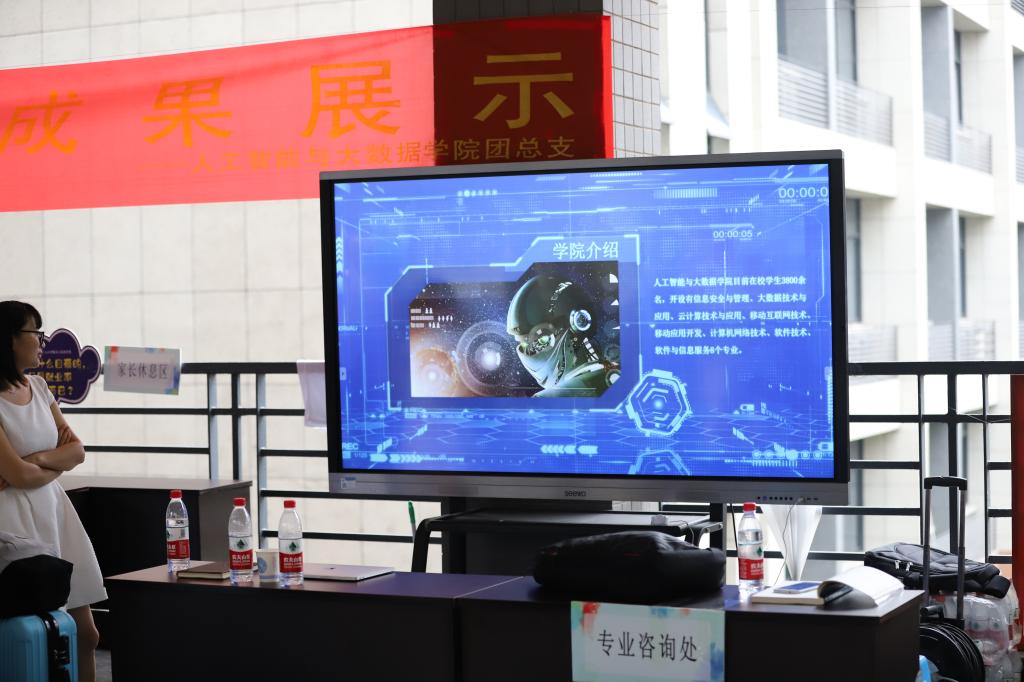 人工智能与大数据学院通过大屏幕展示学院风采,负责老师说道,他们在假期开始搜集素材,大约一星期前做好相关的准备工作,希望通过这种方式突破传统的展板展示,使新生家长更直观了解学院概况。