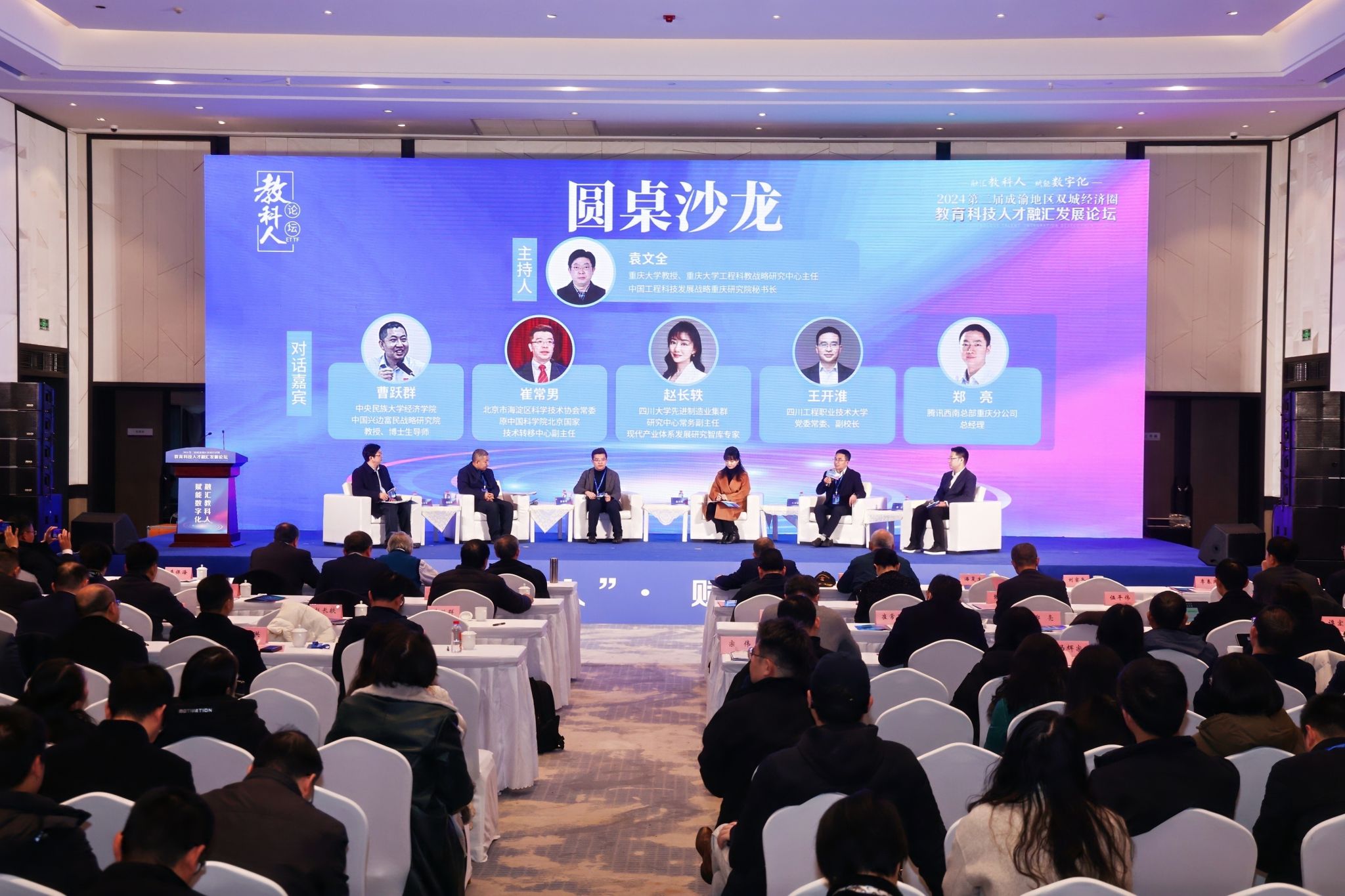 中央民族大学经济学院、中国兴边富民战略研究院教授、博士生导师曹跃群,北京市海淀区科学技术协会常委、原中国科学院北京国家技术转移中心副主任崔常男,四川大学先进制造业集群研究中心常务副主任、现代产业体系发展研究智库专家赵长轶,四川工程职业技术大学党委常委、副校长王开淮,腾讯西南总部重庆分公司总经理郑亮5位专家围绕数字化赋能“教育发展”“科技创新”“人才战略”“产教融合”“产业发展”等议题开展了精彩的观点碰撞。