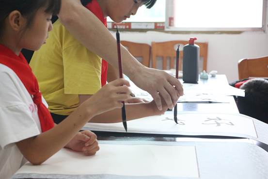 紧接着,指导老师吴梁洲和志愿者们一起手把手教小朋友们学习书法,教小朋友们握笔,一笔一画书写,体味中国传统文化之美,在书写过程中找到乐趣。