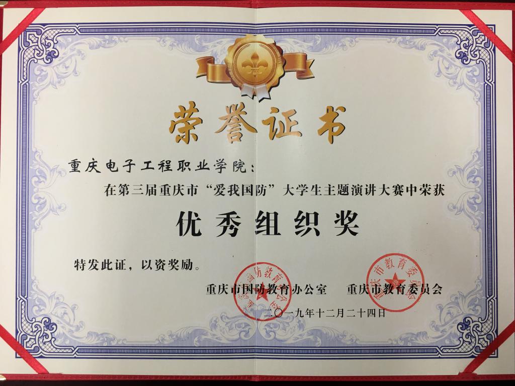 近日,重庆市国防教育办公室和重庆市教育委员会联合印发了《关于关于表彰2019年重庆市“爱我国防”大学生主题演讲大赛获奖单位和个人的通报》(渝国教〔2019〕6号),通报表彰了本次比赛市级决赛先进集体和个人。我校荣获市级决赛优秀组织奖。参赛选手袁彬获市级决赛一等奖、冯浩然获市级决赛三等奖。孙家泽荣获市级决赛优秀指导教师奖。