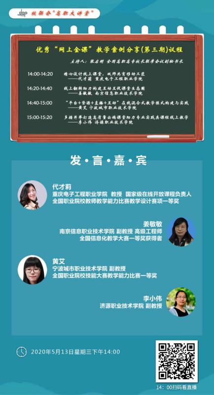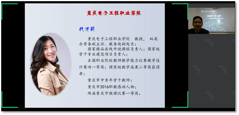 为深入贯彻落实国家“进一步做好在线教育教学”精神,保障在线教学质量,总结教师在线数学的优秀做法和教学成效,形成可复制可推广的典型经验和模式,全国高职高专校长联席会议开展了如何打造优秀“网上金课”在线分享活动。自通知发布后,收到全国145所院校提交的案例,经专家审核,遴选出57个优秀案例,其中12个将以直播形式在网络上与大家分享交流,5月13日14:00我校代才莉老师代表移动通信技术专业教学团队做了《精心设计线上课堂,双师共育移动工匠》专题分享。