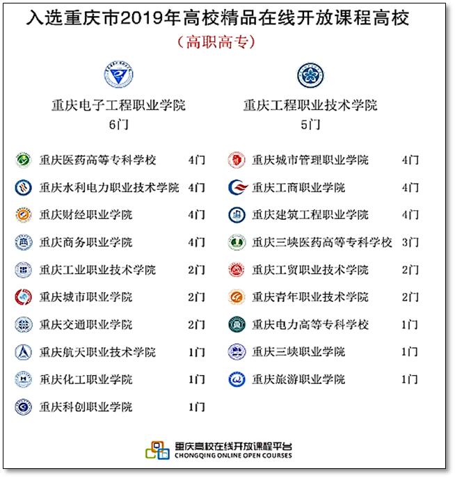 我校一直重视在线开放课程的建设及应用,近几年,我校已建在线开放课程约200门,其中,有1门在线开放课程被认定为“国家级精品在线开放课程”,有19门在线开放课程被认定为“重庆市精品在线开放课程”,有46门在线开放课程被认定为“校级精品在线开放课程”,在线课程建设及应用成效显著。今后,我校将重点推进新专业在线课程的建设,进一步推进线上线下混合式教学,加大精品在线课程的推广力度,提高在线课程的应用效果,为我校培养高素质技能型人才提供有力支持和保障。