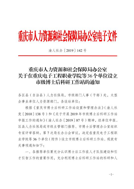 7月1日,重庆市人力资源和社会保障局下发了《关于在重庆电子工程职业学院等36个单位设立市级博士后科研工作站的通知》(渝人社办〔2019〕142号),我校申报的博士后科研工作站获批。