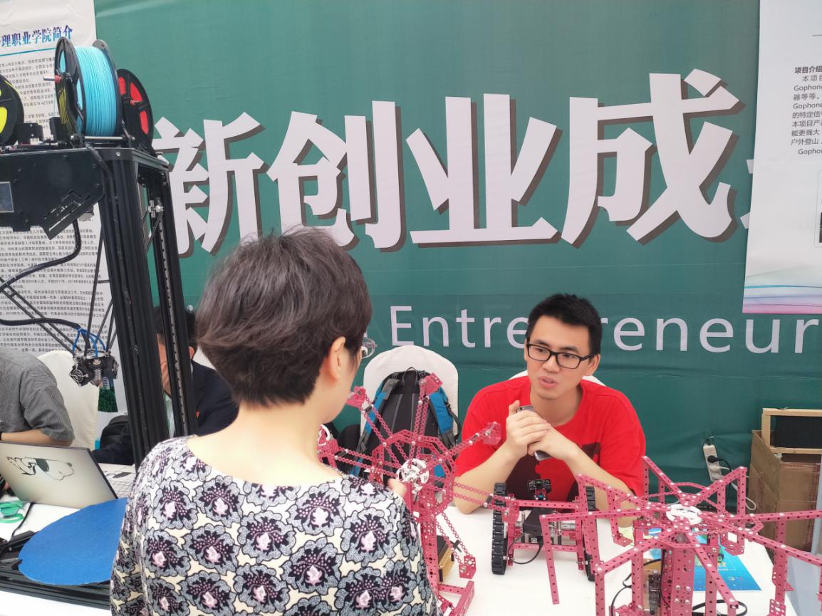 我校优秀创新创业师生代表参加了此次展洽会,展示出丰富的创新创业成果。重庆腾昙科技有限公司团队展出专利发明“3喷头大型RGB混色3D打印机”,弥补了目前市场上3D打印机单色打印的空缺;E小智智能机器人团队展出用于青少年编程、机械组装启蒙教育的智能教育机器人及套件,受到了观众及媒体的关注和热议。
