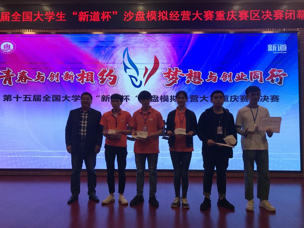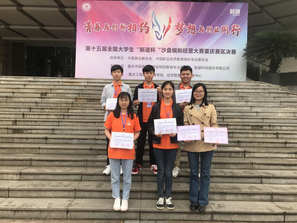 第十五届全国大学生“新道杯”沙盘模拟经营大赛重庆赛区决赛于2019年5月29日-30日在重庆工商大学举行。我校财经管理学院王珞老师指导的付茂祥、王结林、戴劲、游鑫、苟慕寒代表队、赵小刚老师指导的王丽、秦宇东、蔡倩、王倩、漆亚男代表队分别获得决赛一等奖和三等奖,创造了参加“新道杯”沙盘模拟经营大赛历来最好成绩。