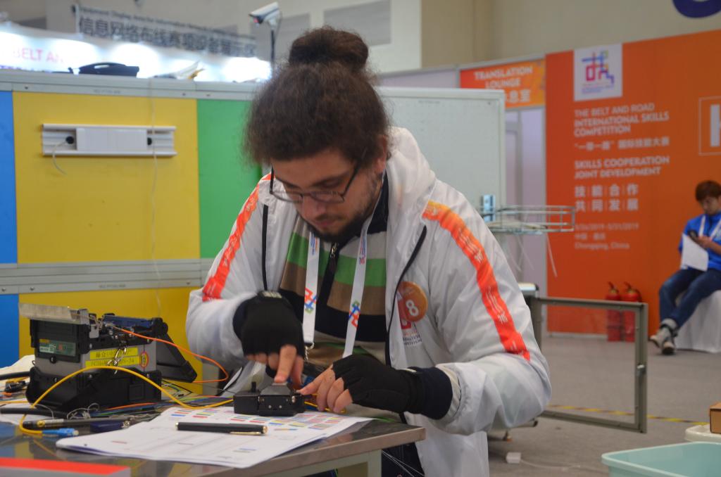 本日的比赛内容重点是室外光纤布线、光纤熔接测试和制线速度测试。9点整,清脆的比赛铃声一响,各国选手迅速剥纤、熔纤等工作。其中,来自中国的选手韦国发技术娴熟,动作规范,引来了许多观众的围观和赞叹;来自新加坡和来自厄瓜多尔的2位女选手,也不甘示弱,紧张操作;来自重庆电子工程职业学院人工智能大数据学院的13号选手柳勇,是网络1801级大一新生,这是他第一次参加这类国际赛项,他表示通过本次大赛学到很多东西,回去后会更加勤练技能,争取下届世界技能大赛取得冠军。学校党委副书记唐玉林、副校长龚小勇也亲临现场,为我们的选手加油鼓劲。