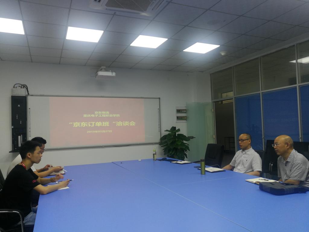 2019年5月27日,京东物流人力资源经理彭鑫、京东物流西南分公司便民校园重庆城市经理杨明一行到我校洽谈组建“京东订单班”,商讨零距离培养行业企业急需的高素质人才。我校财经管理学院院长黄志平、副院长汪启航、物流系主任王雪峰以及合作发展部王希琼参与了洽谈。