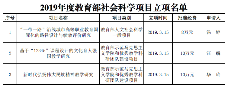 近日,我校在2019年度教育部社会科学项目申报中取得立项3项的好成绩,实现我校近五年国家级科研项目零的突破。同时,我校2019年教育部示范马克思主义学院和优秀教学科研团队建设项目立项数量位列全市高职首位。本次项目信息如下: