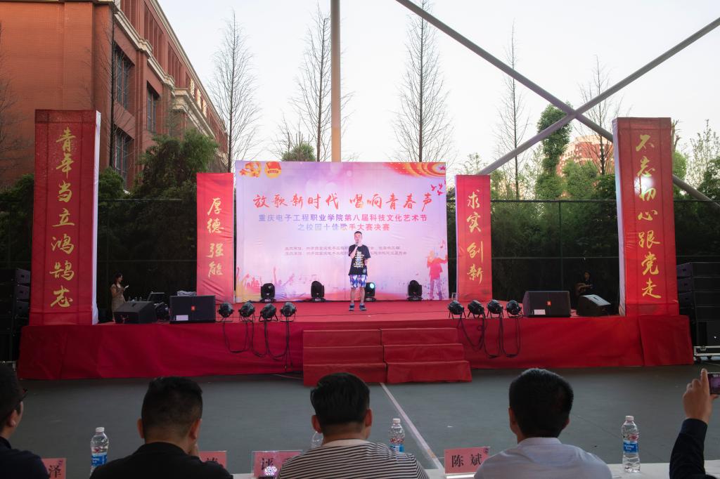 为认真学习贯彻习近平新时代中国特色社会主义思想,全面落实党的教育方针,引导大学生强化理论武装,坚定理想信念。2019年5月23日19:00,由重庆电子工程职业学院校团委主办,通信工程学院团总支承办的重庆电子工程职业学院第八届科技文化艺术节之“放歌新时代·唱响青春声”校园十佳歌手大赛决赛在风雨篮球场正式拉开帷幕。学校领导,各二级学院领导、老师,校团委老师以及特邀评委老师,各二级学院学生会代表、各团支部代表共计500余人参加此次活动。
