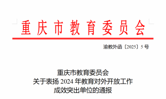 近日,重庆市教育委员会发布《关于表扬2024年教育对外开放工作成效突出单位的通报》,我校国际交流与合作发展处荣获“服务共建‘一带一路’教育行动成效突出单位”称号。这一荣誉充分彰显了我校在服务国家“一带一路”倡议、推动教育国际合作与交流方面的显著成效。