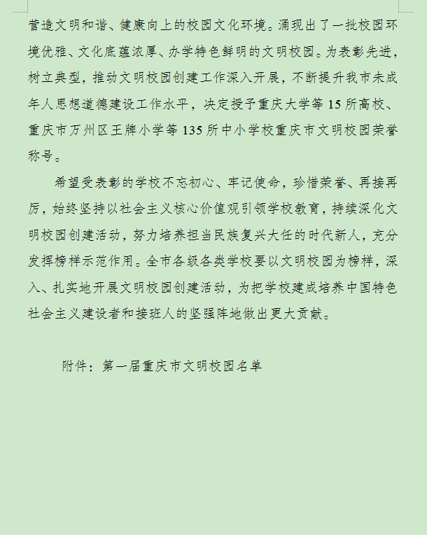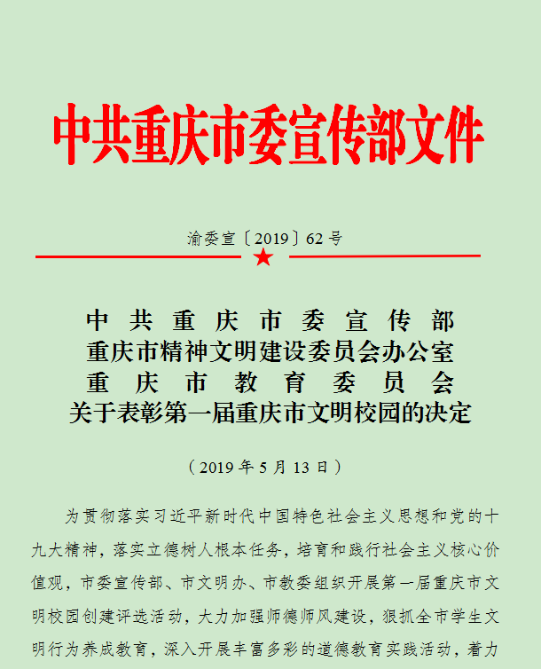 5月14日,中共重庆市委宣传部印发了《中共重庆市委宣传部重庆市精神文明建设委员会办公室重庆市教育委员会关于表彰第一届重庆市文明校园的决定》(渝委宣〔2019〕62号),我校被授予“重庆市文明校园”荣誉称号。