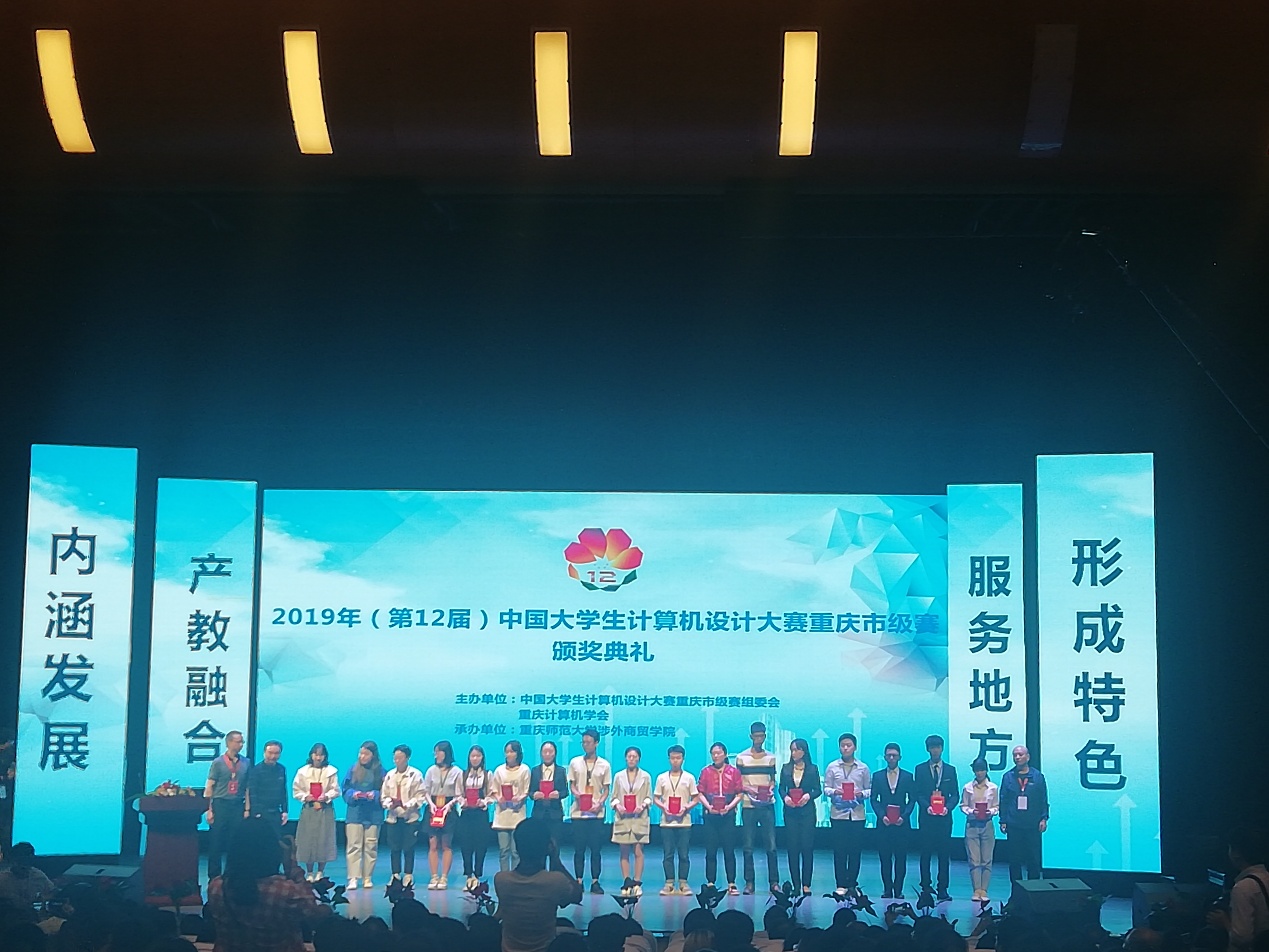 2019年5月11日,“2019年中国大学生计算机设计大赛重庆市赛”在重庆师范大学涉外商贸学院落下帷幕,我校荣获优秀组织奖1项、一等奖1项、二等奖5项、三等奖11项。
