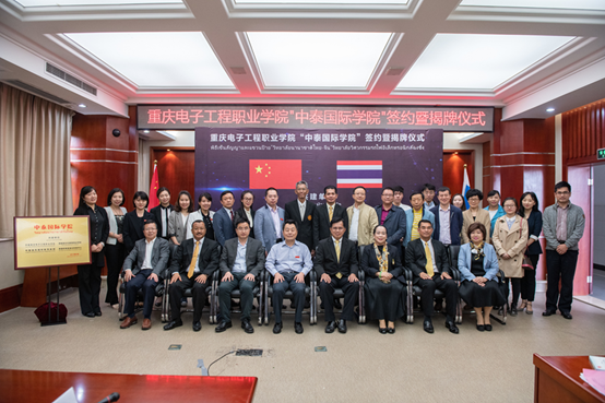 5月13日上午,重庆电子工程职业学院“中泰国际学院”签约暨揭牌仪式在博润厅举行。泰方代表泰国政府总理办公室特别顾问本松.禅颇博迪先生(.Boonsong Champabhoti)、曼谷职业教育中心主任冲普努.波邦松女士(Chompunuch Buabangsorn)、曼谷职业教育中心副主任乌玛蓬.柴桑仁女士(Umaporn Chaichamroen)、切都蓬商业学院院长颂蓬.楚同先生(Somporn Chutong)、切都蓬商业学院副院长阿塔彭.菲普鲁克萨先生(Attapon Phonprueksa)、民武里技术学院学生家长与教师联席会会长斯勒拉锋.斯帕萨丁.纳.艾尤斯亚先生(Threraphon Thephasadin Na Ayuthya)及中方代表重庆市教委国际处副处长陈炳君、中泰职教联盟中方秘书长吴再生、唐风国际教育集团职业教育分管副总经理王秀青女士,重庆电子工程职业学院党委书记孙卫平、校长聂强、国际交流与合作发展处处长莫绍强、通识教育与国际学院院长沈雕、学校相关部门和二级学院负责人、老师代表出席会议。仪式由重庆电子工程职业学院副校长龚小勇主持。