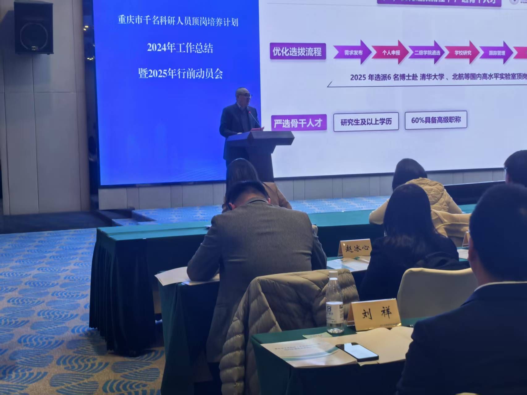 3月18日下午,由市人社局主办的重庆市千名科研人员顶岗培养计划2024年工作总结暨2025年行前动员会成功举行。党委常委、副校长幸昆仑教授,人力资源处副处长黄祎,人工智能与大数据学院博士赵冰心受邀参加。
