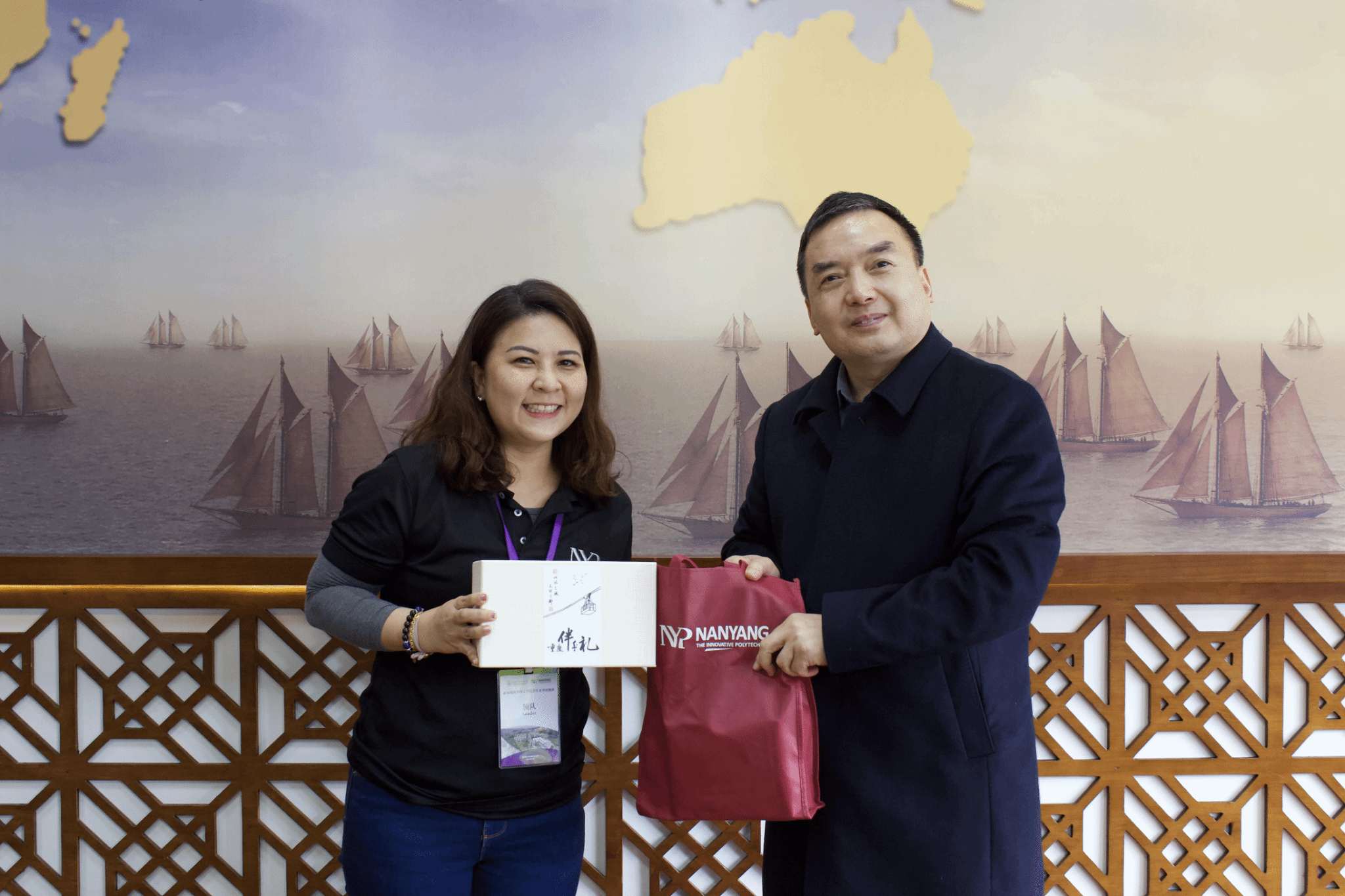 仪式上,幸昆仑副校长为新加坡南洋理工学院的学生代表佩戴了校徽,标志着他们在中国重庆的学习和生活之旅正式开启。随后,聂强校长代表我校与新加坡南洋理工学院的林爱惠,陈伟松老师互换了纪念礼物,象征着两校友谊长存。