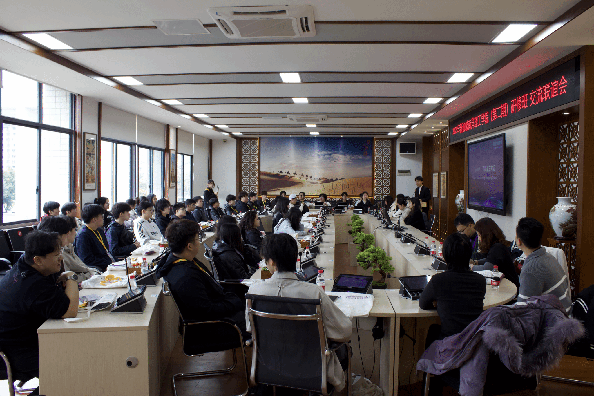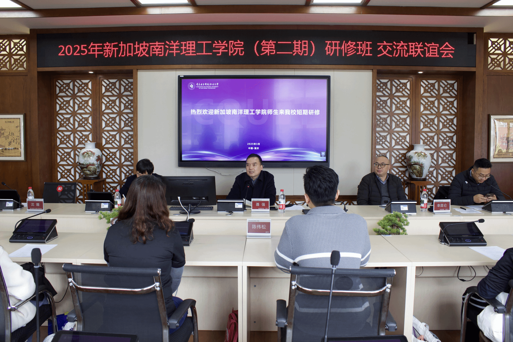 2025年3月17日,新加坡南洋理工学院33名师生代表抵达我校开启短期访学研修之旅。18日上午,在知行楼B408丝路会议室举行了“新加坡南洋理工学院(第二期)研修班”开班仪式和交流联谊会。学校党委副书记、校长聂强,党委常委、副校长幸昆仑,党委学工部、国际合作与交流处、电子与物联网学院相关负责人和教师代表及新加坡南洋理工学院领队林爱惠、陈伟松老师和31位新加坡学员出席了本次开班仪式。仪式由国际交流与合作发展处副处长刘影主持。