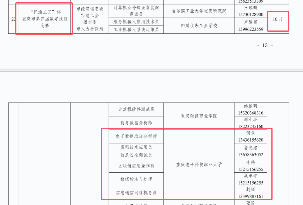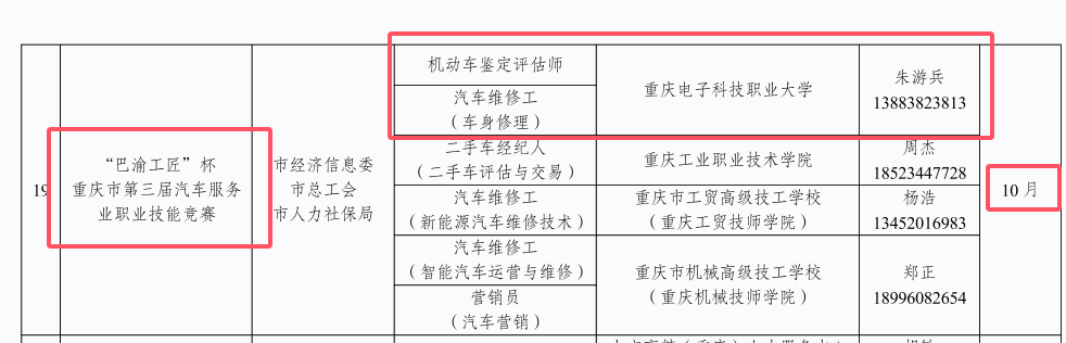 我校获批其中“巴渝工匠”杯重庆市第三届汽车服务业职业技能竞赛(机动车鉴定评估师、汽车维修工(车身修理))和“巴渝工匠”杯重庆市第四届数字技能竞赛(电子数据取证分析师、密码技术应用员、信息安全测试员、区块链应用操作员、数据标注与处理、信息通信网络机务员)2个大赛,8个赛项的承办权。