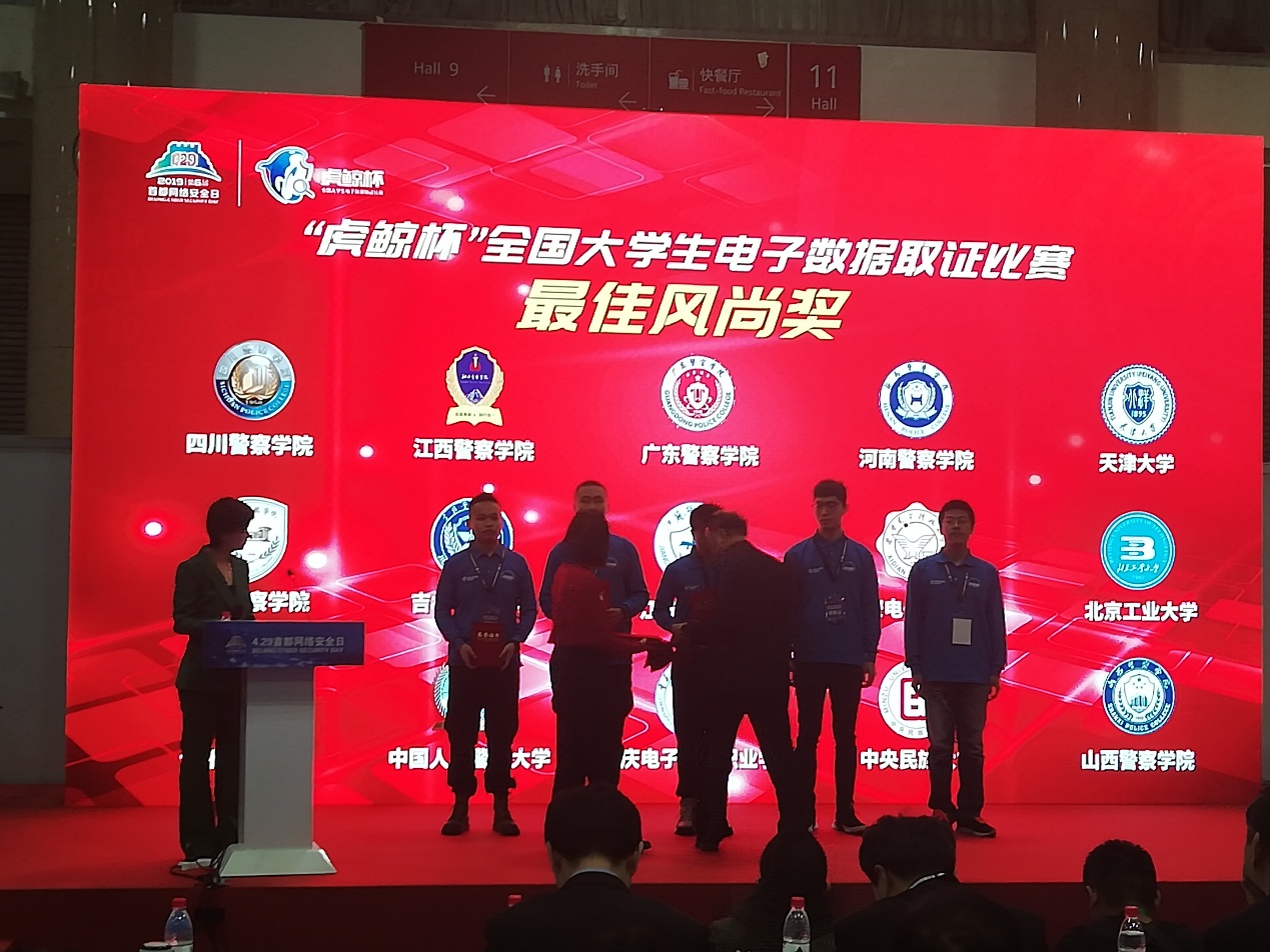 我校人工智能与大数据学院何欢、黄将诚、徐宏英三位老师指导的学生杨洋、张渝、刘鑫成组成的学生团队荣获“最佳风尚奖”,中国工程院院士沈昌祥院士亲自为我校代表队颁奖。此次大赛,我校代表队与天津大学、中国政法大学、中国人民公安大学等大批全国重点院校学生同台竞技并获“最佳风尚奖”殊荣,进一步提高了我校知名度,彰显了学校的办学水平。