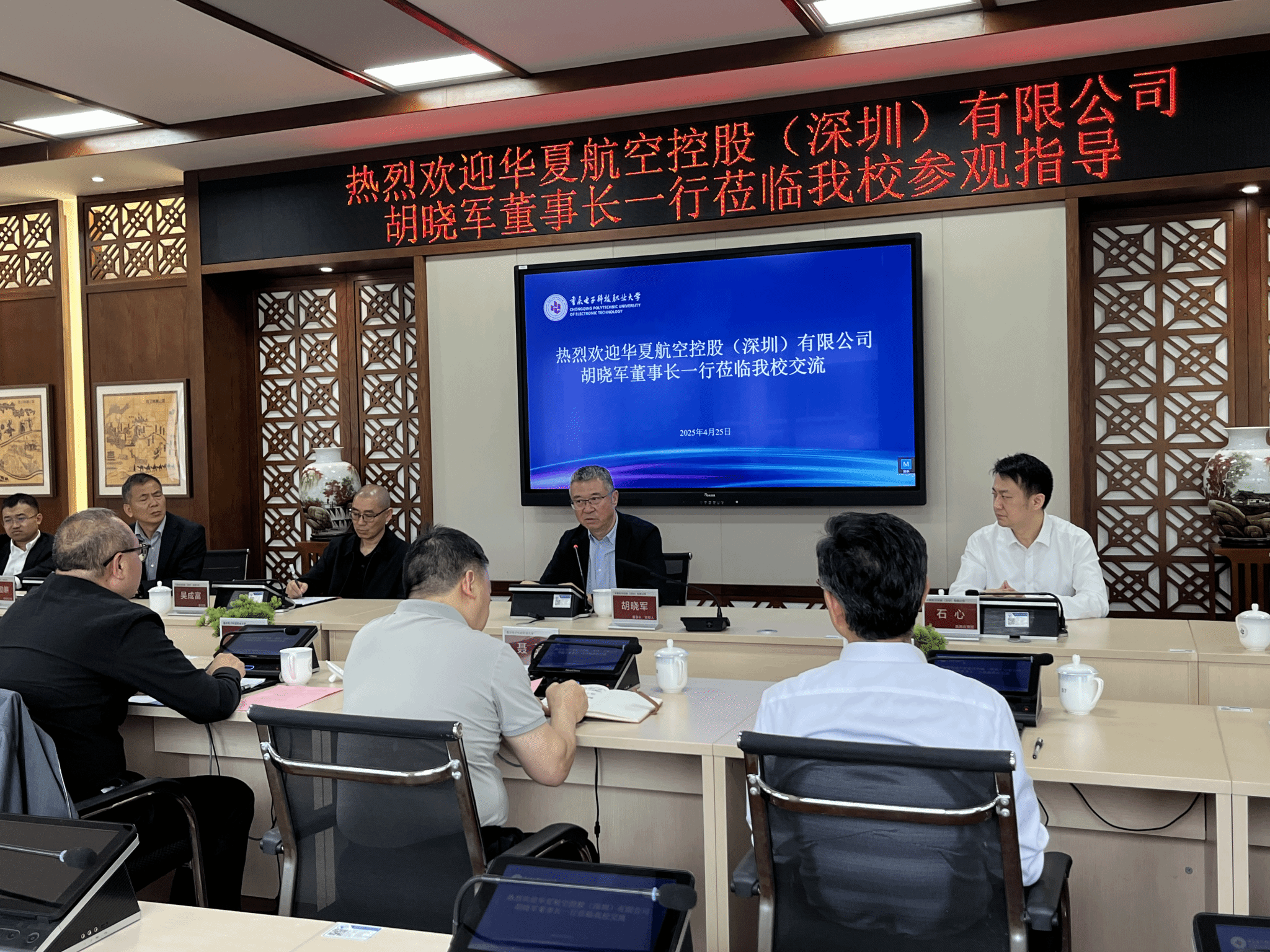 2025年4月25日,华夏航空控股(深圳)有限公司董事长胡晓军率队访问我校,双方围绕职业教育创新与产教融合展开深度交流。校长聂强,副校长幸昆仑、副校长刘成俊及相关部门负责人参加交流。