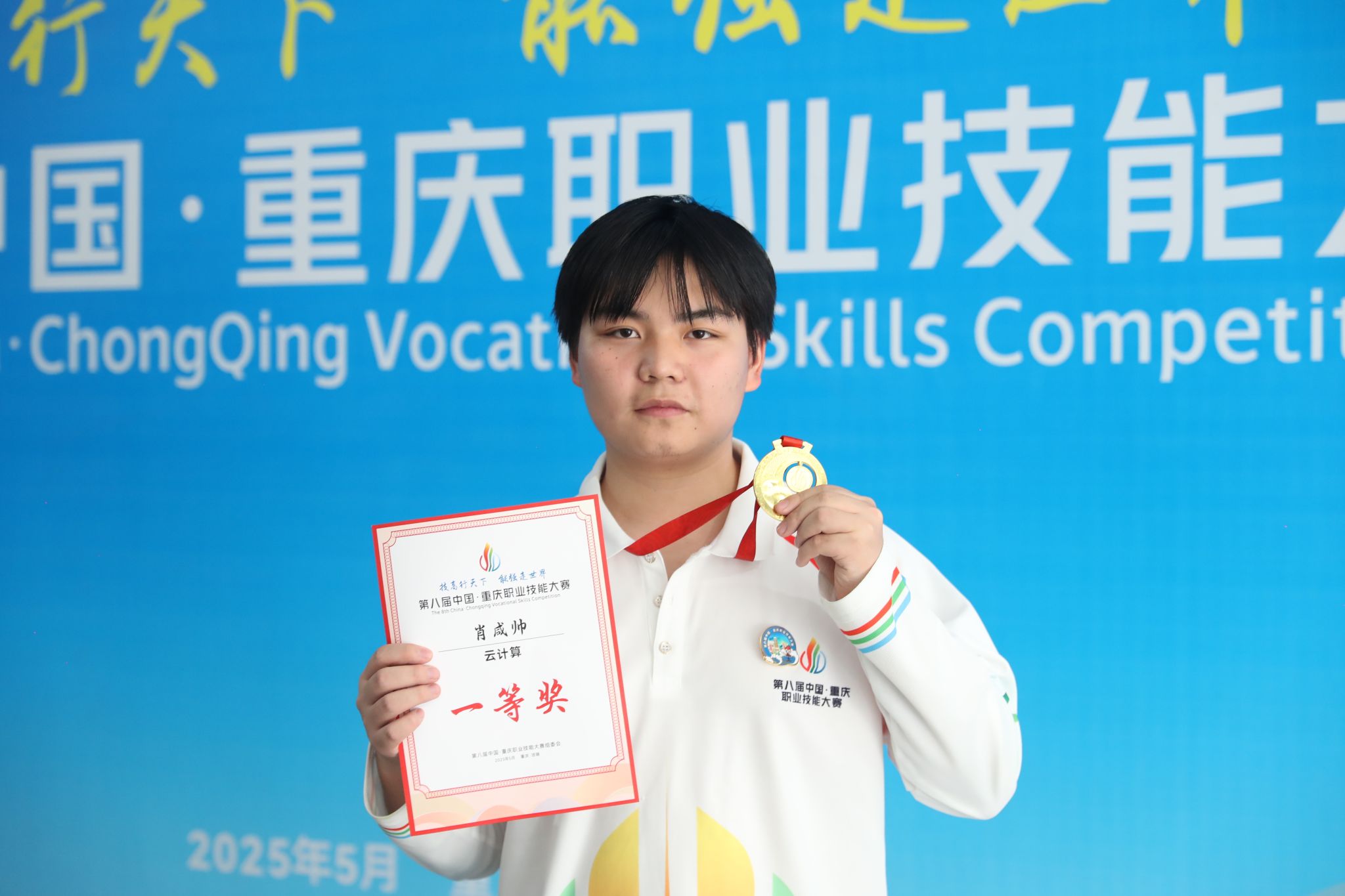 5月20-23日,由重庆市人民政府主办,市人力社保局、市教委、市农业农村委、市总工会、团市委、市妇联、涪陵区人民政府承办的第八届中国·重庆职业技能大赛在涪陵举行,我校人工智能与大数据学院云计算技术应用专业2023级学生肖咸帅代表沙坪坝区参加了“云计算”赛项比赛,与全市19个区县选派的代表同场竞技,经过激烈角逐,肖咸帅荣获云计算赛项金牌(一等奖),这也是沙坪坝区代表队在此次比赛中获得的唯一金牌。