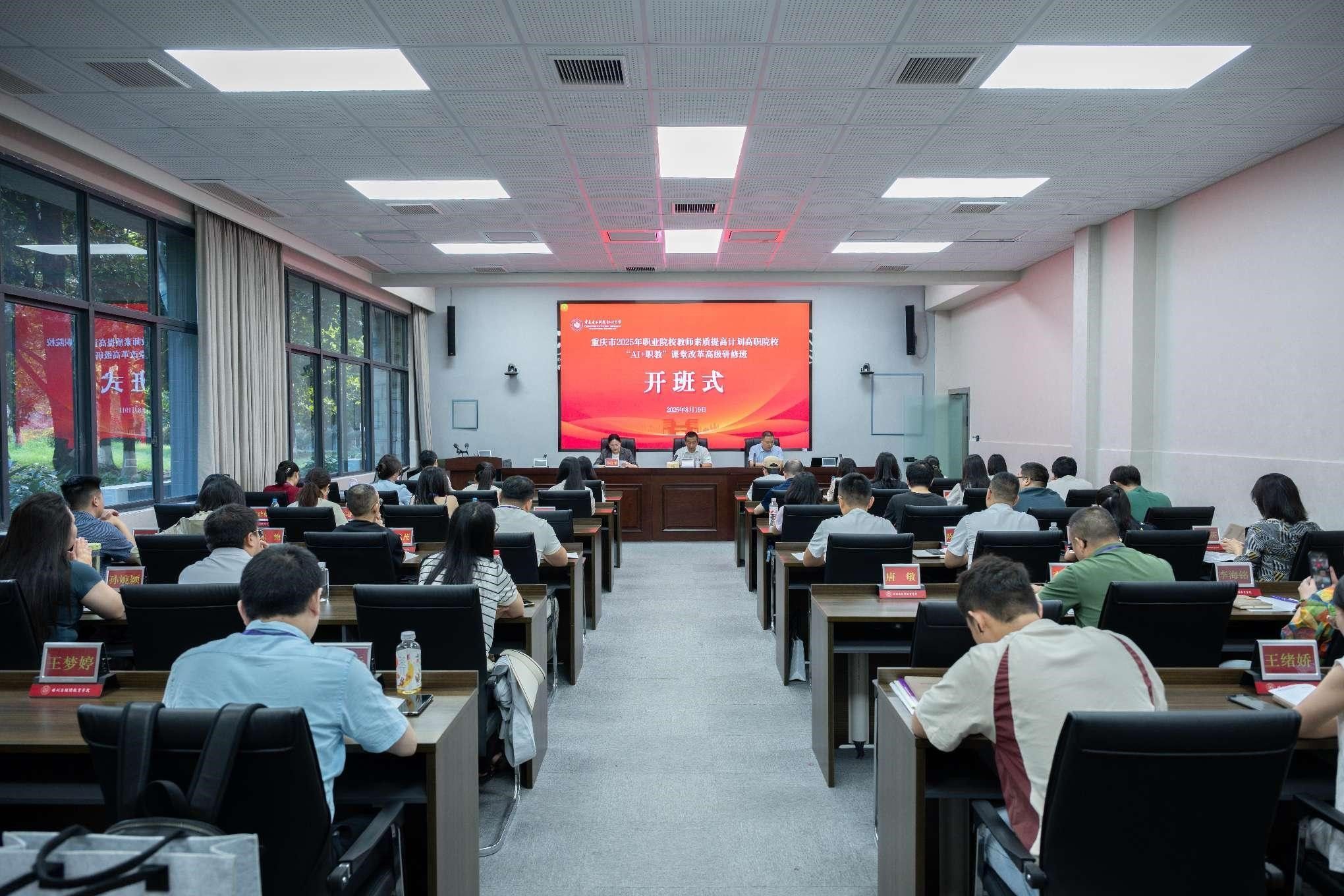 2025年8月19日上午,重庆市2025年高职院校“AI+职教”课堂改革国家级高级研修班开班式在我校大学城校区知行楼A座博学厅举行,来自全市各高职院校的60名教师参加培训。