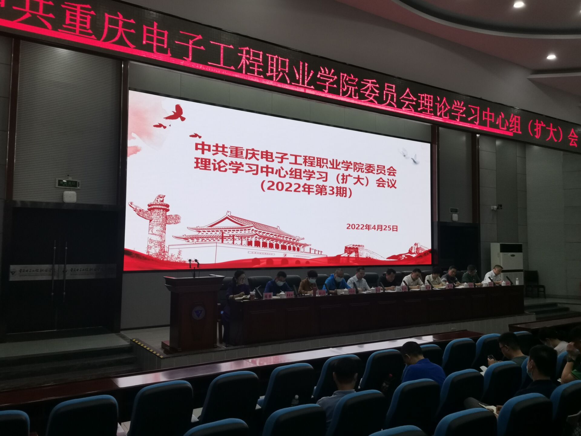 4月25日上午,重庆电子工程职业学院在博远厅召开党委理论学习中心组(扩大)会议,专题学习习近平总书记在全国两会期间重要讲话精神及全国两会精神。全体校领导、处级领导干部参加会议。学校党委书记孙卫平主持会议。