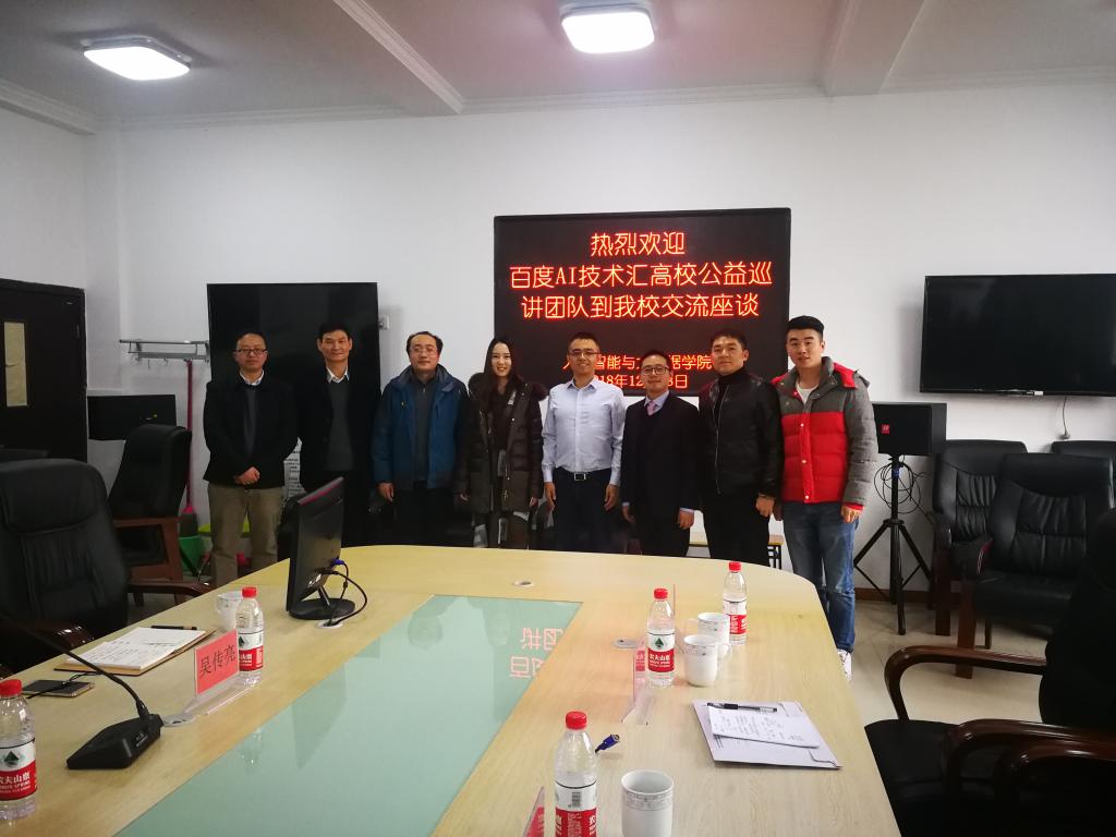 2018年12月18日上午,百度AI技术汇高校公益巡讲团队到我校召开了人工智能领域的校企合作交流座谈会。参加本次座谈会的领导和嘉宾有:人工智能与大数据学院副院长童世华、党总支副书记刘宏宇、百度校园品牌部经理马天野女士、国信蓝桥CT0张亮先生等,人工智能与大数据学院教师胡云冰、邓剑勋等参会交流。会议由人工智能与大数据学院朱堂勋老师主持。
