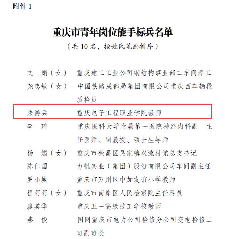 共青团重庆市委、重庆市人力资源和社会保障局于2018年12月16日联合发文(渝青发〔2018〕74号)对2017-2018年度重庆市青年岗位能手(标兵)选树命名情况进行了通报,我院朱游兵老师获得重庆市青年岗位能手(标兵)荣誉称号。