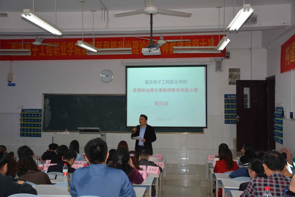 为深入学习贯彻习近平新时代中国特色社会主义思想和党的十九大精神,持续贯彻落实全国全省高校思想政治工作会议精神,切实加强我校思想政治理论教师队伍建设,提升思政课教师的教学能力和业务水平,校党委宣传部和马克思主义学院于2018年11月1日下午在7-109成功举办“重庆电子工程职业学院第四届思想政治理论课教师技能大赛”。学校党委副书记唐玉林教授,质量管理中心主任钟国祥教授、通信工程学院党总支书记曾晓宏教授、通信工程学院副院长刘良华教授、教务处副处长代才莉副教授以及马克思主义学院全体教师和各二级学院教师及学生代表现场观摩了此次大赛。来自重庆警察学院思政部的王银生教授,重庆医药高等专科学校马克思主义学院院长董杨副教授,重庆城市管理职业学院马克思主义学院党总支副书记、副院长杨飏副教授,重庆电子工程职业学院苏小柱教授和骆永菊教授以及来自二级学院的5名学生大众评审担任比赛的评委。本次大赛由马克思主义学院副院长冉鑫副教授主持。