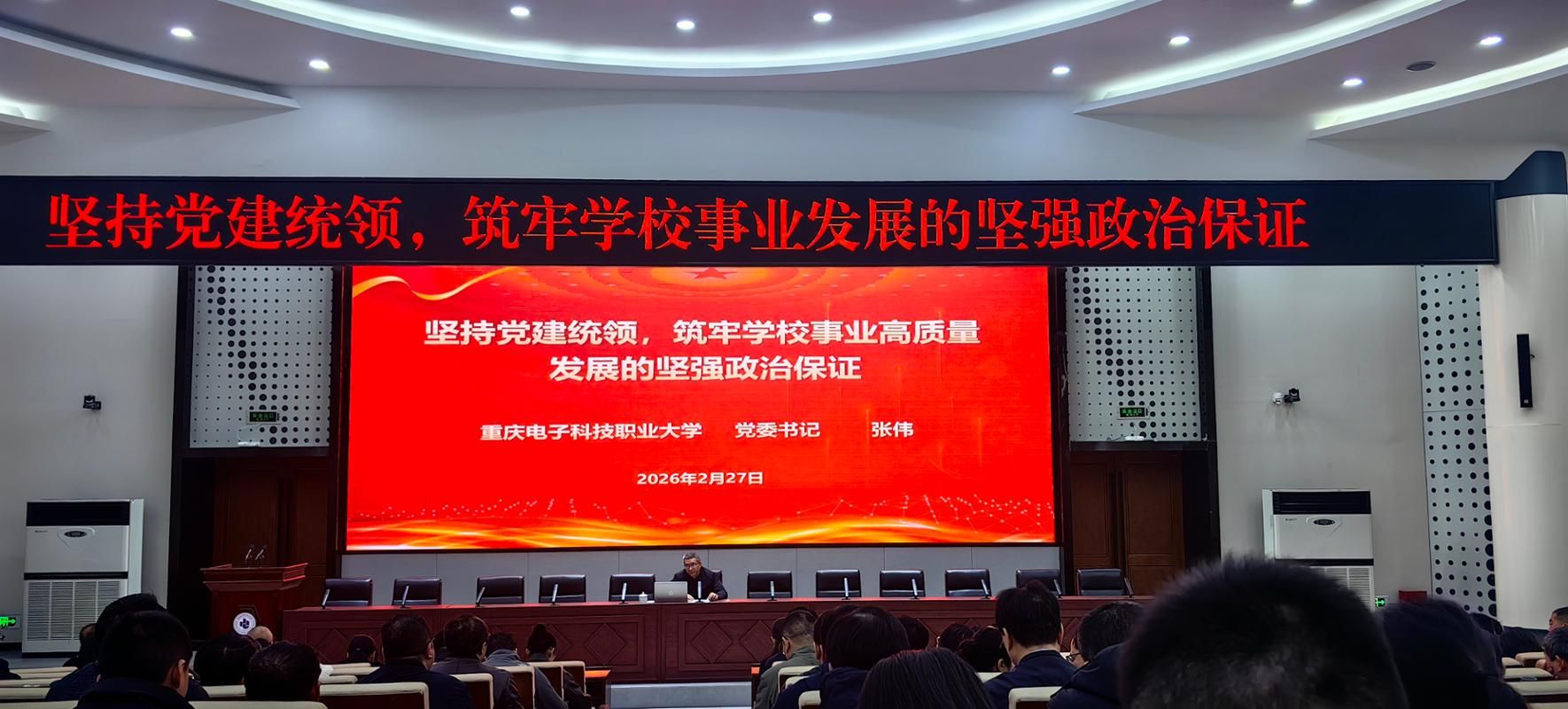 党委书记张伟以《坚持党建统领,筑牢学校事业高质量发展的坚强政治保证》为题作主旨报告。他首先肯定了2025年学校各项工作取得的显著成效,指出2025年作为“十四五”收官之年,学校胜利召开第一次党员代表大会,描绘“三步走”发展目标和“1235”发展思路,成功举办建校60周年高质量发展大会,入选国家及重庆市第二期“双高计划”高水平学校建设单位,新增职业本科专业5个,立项国家自科、社科基金5项,新增博士57名及多名高层次人才,各项事业实现跨越式发展,为“十五五”开局奠定坚实基础。他强调,新学期要纵深推进“964党建工作体系”,做实“九张报表”、用活“六张清单”、健全“四项机制”;完善党建与事业发展“五同步”融合机制,推动党建与业务同频共振;抓好市委巡视整改,营造风清气正的政治生态;开展树立和践行正确政绩观学习教育,涵养实干担当作风;高质量编制“十五五”规划,融入区域发展大局;深化职业本科内涵建设,推进专业、课程、教材等教学关键要素改革;丰富“重电发展模式”,深化产教融合、科教融汇;全力冲刺国家级成果、技能竞赛金牌等标志性成果,提升核心竞争力。