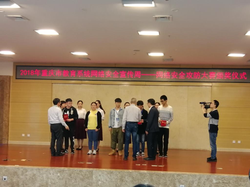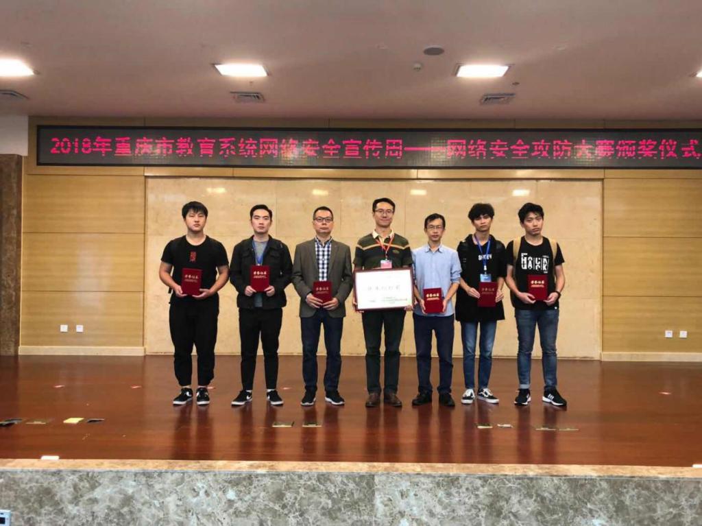 2018年9月18日,在重庆市网络安全宣传周活动中,我校人工智能与大数据学院网络空间安全系教师鲁先志和胡兵老师带领的“枫雪”、“0&1”战队经过激烈的角逐分别获得重庆市教委举办的网络安全攻防大赛一等奖和二等奖。