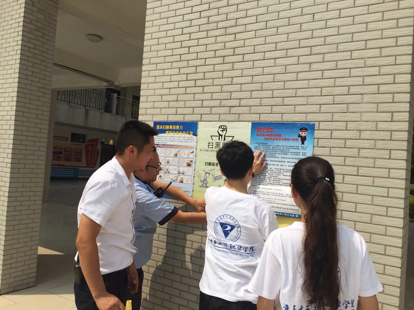 为深入贯彻落实党的十九大精神,保障人民安居乐业、社会安定有序、国家长治久安,重庆电子工程职业学院积极响应开展扫黑除恶专项斗争的号召,充分发挥基层组织在扫黑除恶工作中的职能作用,有效推动扫黑除恶专项斗争深入开展,维护社会和谐稳定。切实履行工作职责,结合工作实际,科学谋划,整合法治宣传、人民调解、社区矫正、法律援助、群防群治等多方面的力量,强化部门配合,持续有效推动扫黑除恶工作。