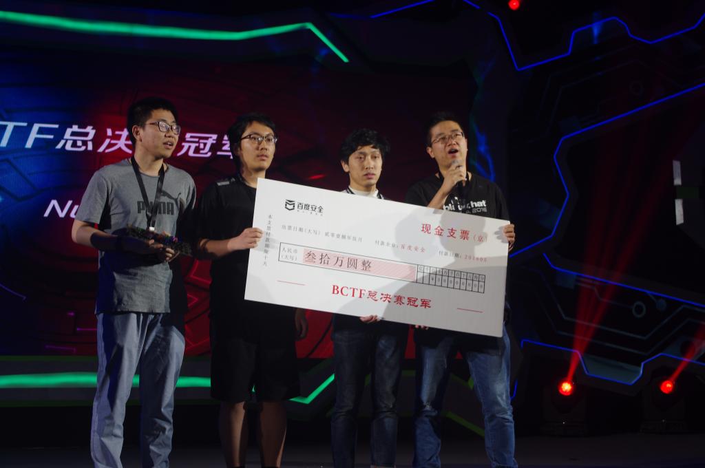 2018年5月12日,我校信息安全创新工作室学生李明健,作为Nu1L(参赛团队名称)战队成员,参加DEF CON China和百度安全联合举办的BCTF(百度国际网络安全技术对抗赛),Nu1L团队获得了“百度国际网络安全技术对抗赛”总决赛的冠军,斩获本次比赛的最高奖金30万元。