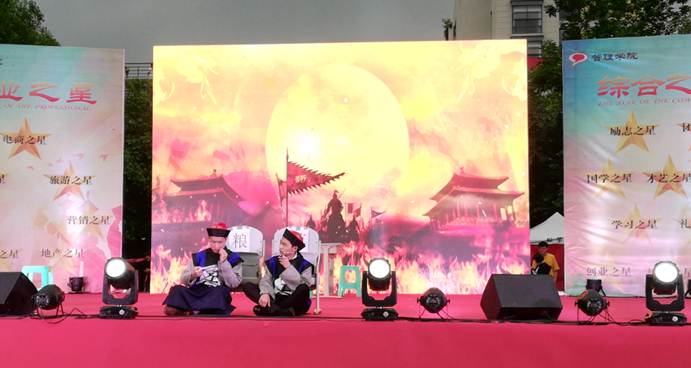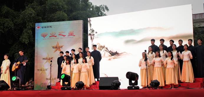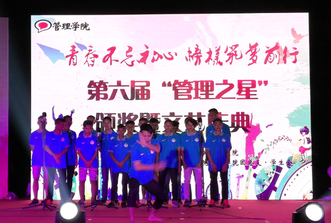 2018年5月9日晚6:40,天公作美,小雨停歇,“管理之星--学生标兵领航行动”颁奖暨文艺庆典在青春洋溢的啦啦操表演中拉开序幕。弹唱结合的《国乐吟诵》展现了文科学子的艺术功底,小品《戏说禁烟》提高了学生对吸烟危害的认识,集体诗朗诵《盛世中国》抒发了同学们对民族复兴和国家崛起的坚定信念,舞台音乐剧《爱的传递》表现了青年一代对父母养育之恩的感激。