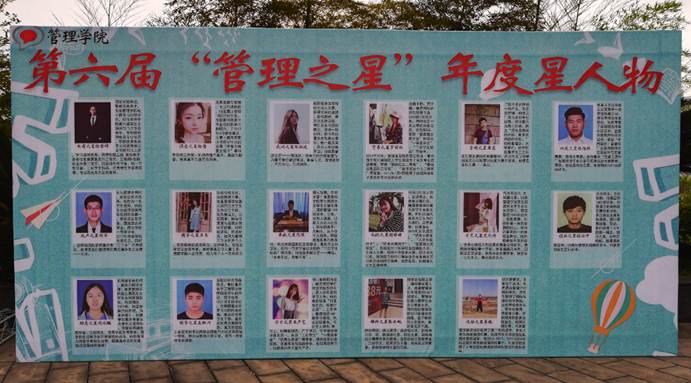 一年一度“管理之星”评选活动始于2005年,最初叫“工商之星”,2013年改为“管理之星”,是管理学院的传统活动和特色项目,已经成为学院的一张文化名片。2016年,“管理之星”——学生标杆领航行动荣获“重庆市十佳精品学生活动”,2017年成功申报学校校园文化精品建设项目。