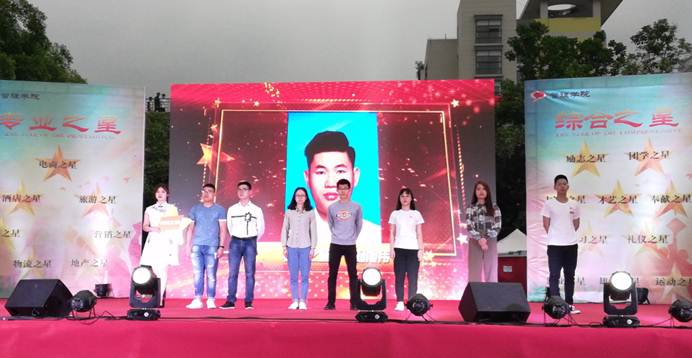 第六届“管理之星”活动以“青春践行中国梦,不忘初心跟党走”为主题,通过“本人自荐、师生推荐、组织评议、多方公示”相结合的评比方式,共评选出七名“专业之星”(国贸之星、物流之星、地产之星、营销之星、酒店之星、旅游之星、电商之星),十名“专长之星”(科技之星、雄辩之星、礼仪之星、才艺之星、运动之星、创业之星、励志之星、自学之星 、国学之星、团学之星),还有“先进班级”、“标杆寝室”等集体项目。